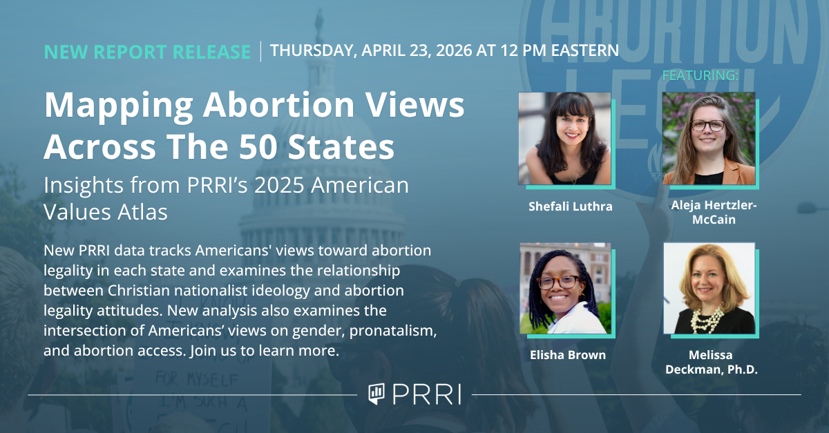 Join PRRI for a timely webinar unpacking the survey’s findings and what they reveal about Americans’ views more than three years since the Dobbs decision shifted the U.S. political landscape. Register to attend live or to receive the recording.
