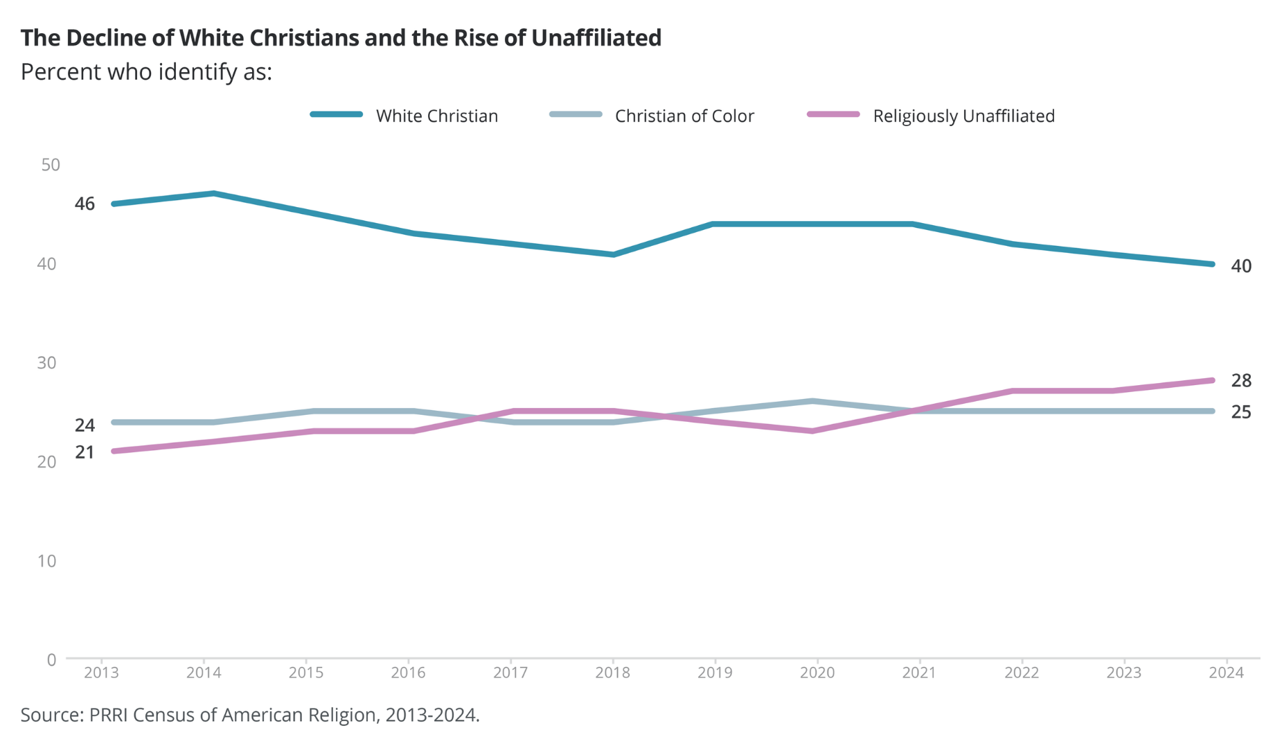 Deckman provided context using data from the PRRI Census of American Religion, noting that the percentage of white Christians in the United States declined from 46% in 2013 to 40% in 2024, reflecting a rise in the number of Americans who are disaffiliating from religion and increasing racial diversity in the country. Additionally, she highlighted that charismatic practices are particularly prevalent among Black Protestants, with 66% reporting they have experienced three or more charismatic events at religious services, compared with 31% of American churchgoers overall.