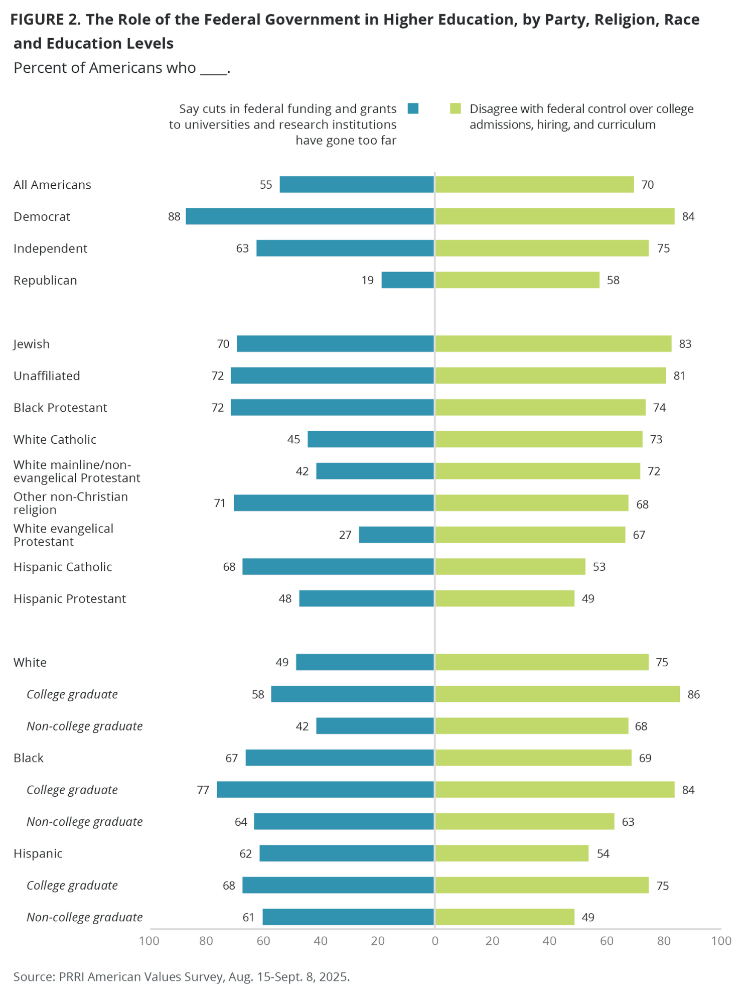 PRRI’s 2025 American Values Survey also shows that most Americans (57%) have a great deal or some confidence in colleges and universities.