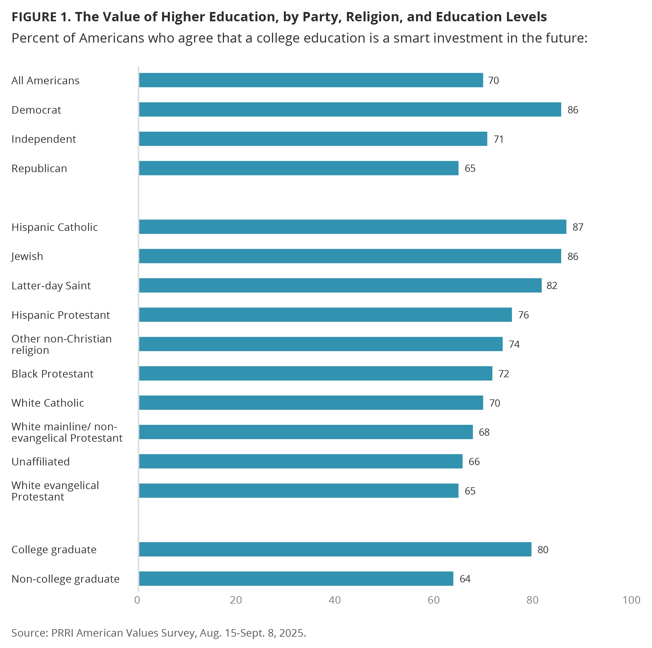 PRRI’s 2025 American Values Survey finds that seven in ten Americans agree that a college education is a smart investment (70%), compared with 27% who disagree. Although partisans differ, solid majorities agree: 86% of Democrats, 71% of independents, and 65% of Republicans.[1]