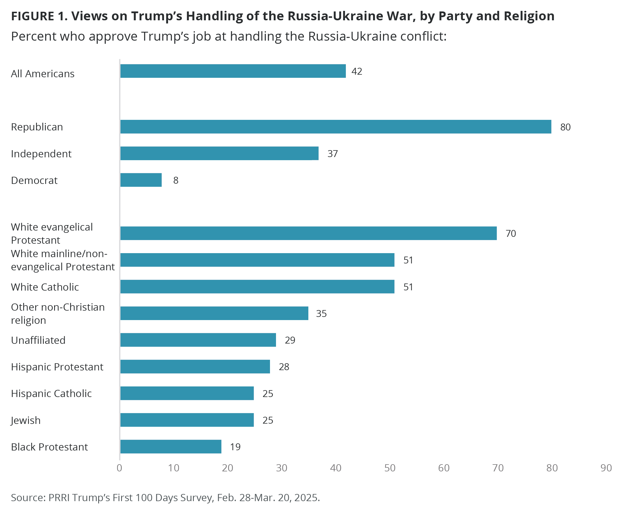 PRRI’s 2025 survey on Americans’ attitudes 100 days into the Trump administration shows that four in ten Americans (42%) approve of the president’s handling of the war with Russia and Ukraine, compared with 56% of Americans who disapprove. While most Republicans (80%) approve of Trump’s handling of the war, just 37% of independents and 8% of Democrats do.
