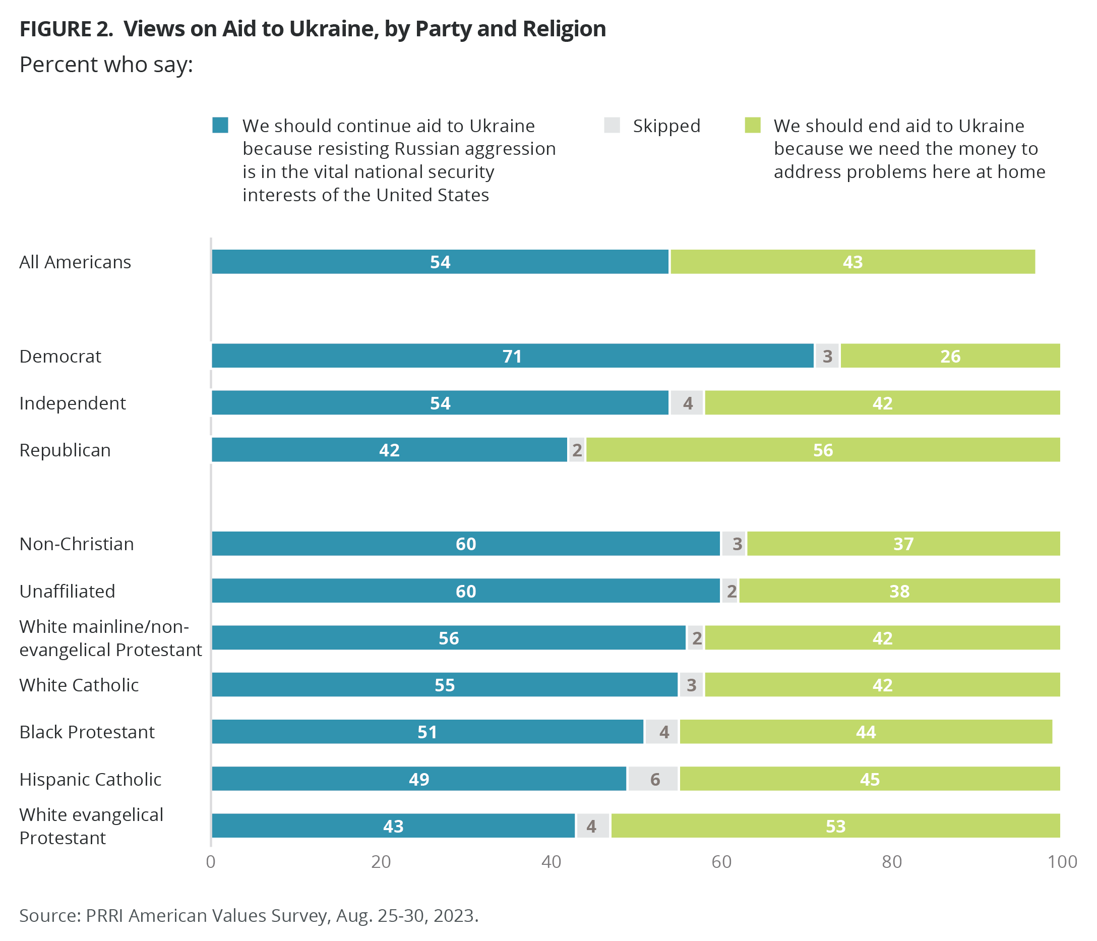 According to the Council on Foreign Relations, the United States has committed $128 billion in aid to the government of Ukraine as of 2025. PRRI’s 2023 data showed that a majority of Americans (54%) support sending “aid to Ukraine because resisting Russian aggression is in the vital national security interests of the United States.” Majorities of Democrats (71%) and independents (54%) support sending aid to Ukraine, compared with 42% of Republicans.