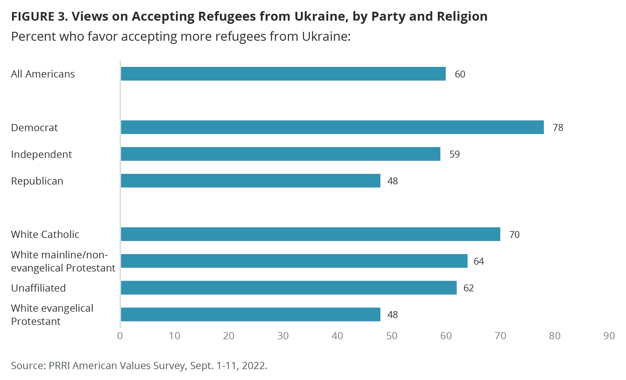 Except for white evangelical Protestants (48%), the majority of other white Christian groups, including 70% of white Catholics and 64% of white mainline/non-evangelical, favored accepting refugees from Ukraine. In addition, most unaffiliated Americans (62%) also favored accepting refugees from Ukraine.[2]