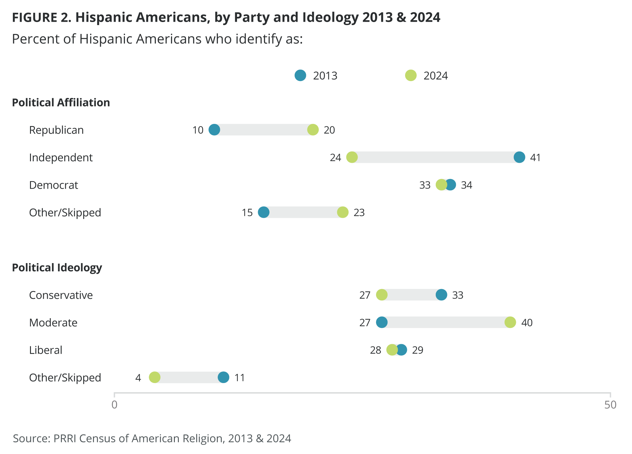 Data from the PRRI American Values Atlas show that in 2023, 39% of Hispanic Americans who are religiously unaffiliated identify as Democrats, an increase of nine percentage points from 30% in 2013. By contrast, unaffiliated Hispanic Americans who identify as Republicans and independents have declined from 8% and 51%, respectively, in 2013 to 4% and 37%, respectively, in 2023. Similarly, unaffiliated Hispanic Americans are three times less likely to identify as conservative today than they did in 2013 (8% vs. 24%), growing more moderate (from 26% to 34%) and liberal (from 41% to 57%) during this period.