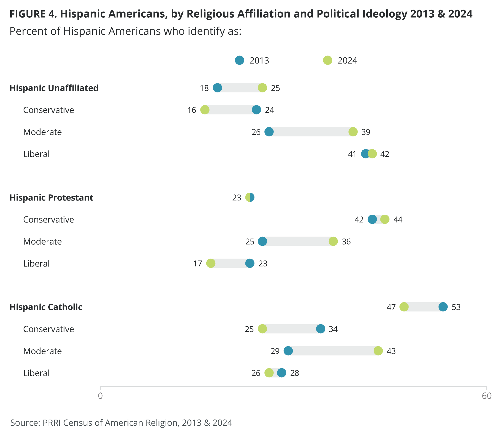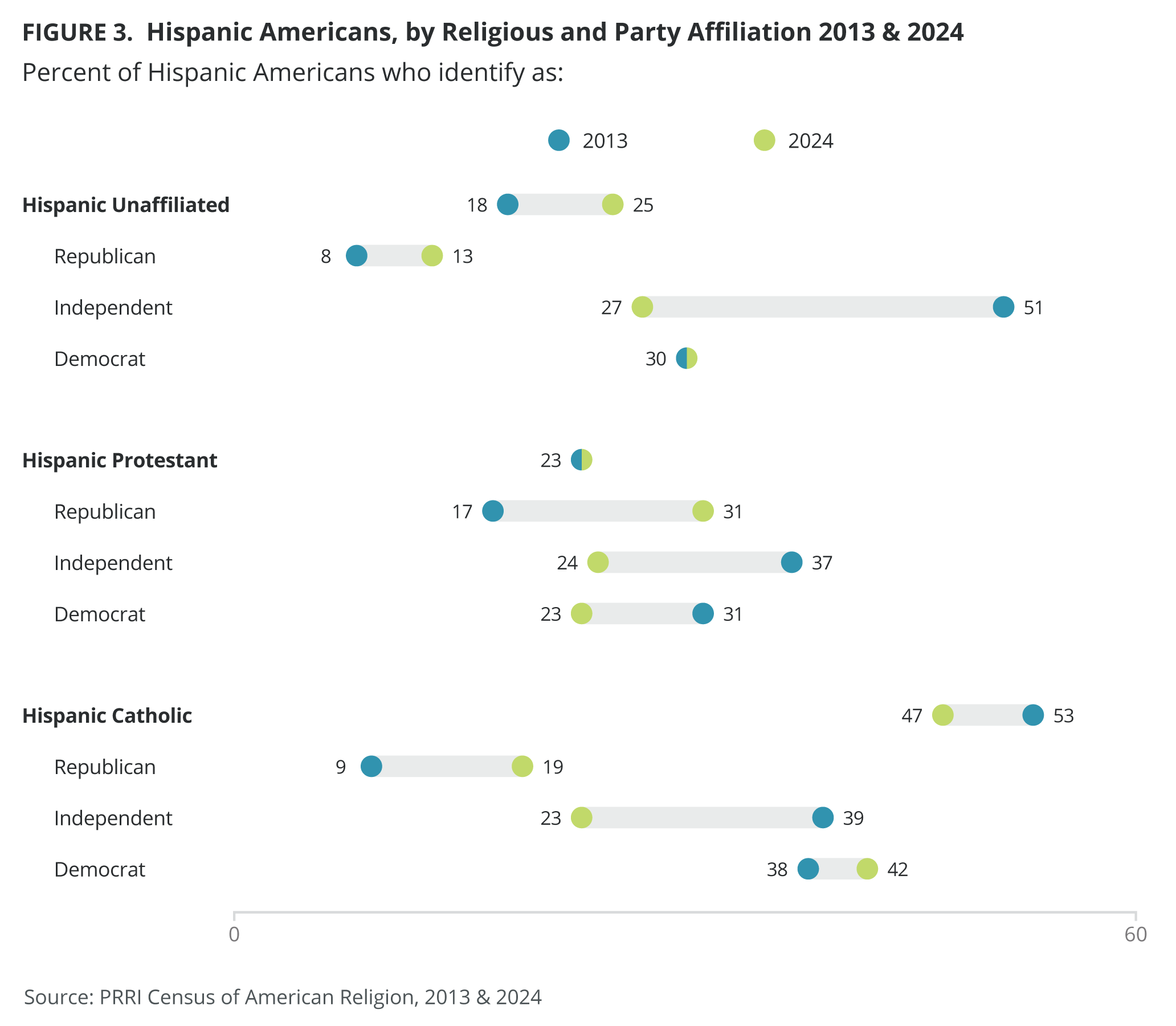 According to PRRI surveys, including the recent Climate Change survey, the percentage of Hispanic Americans who identify as religiously unaffiliated has grown consistently over the past decade from 18% in 2013 to 24% in 2023. Those who identify as Christian have decreased slightly from 79% in 2013 (including 53% who were Catholic and 23% who were Protestant) to 73% today (46% who identify as Catholic and 21% who identify as Protestants).