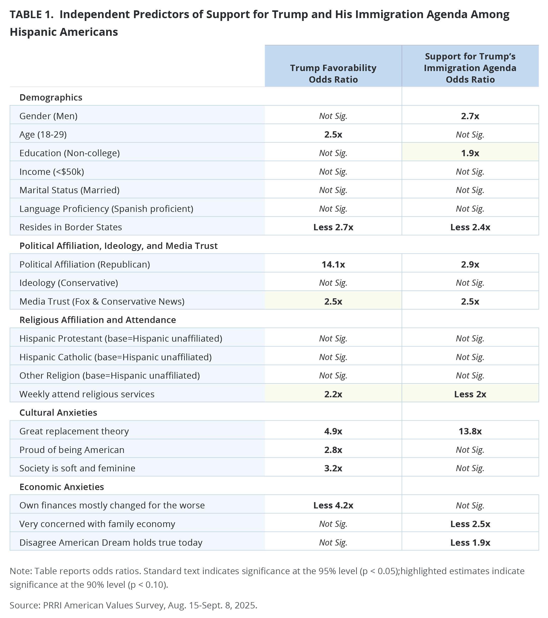 PRRI developed a model to test various factors in predicting support for Trump among Hispanic Americans in 2025, finding that aside from partisanship, views of Trump and the job he is doing on immigration are driven by economic concerns, cultural anxieties, and religiosity. Using data from the 2025 PRRI American Values Survey, we conducted two logistic regression models among Hispanic Americans to determine the roots of Hispanic Americans’ support for Trump, focusing on two key dependent variables: Trump favorability and support for his immigration agenda, based on a recently developed immigration scale published in our latest report.[3]