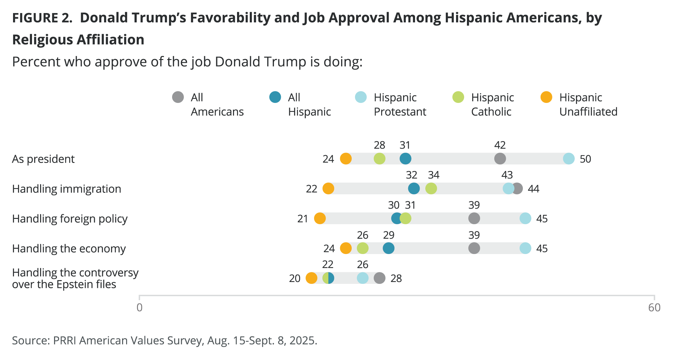 Hispanic Americans are 10 percentage points less likely to approve of the job Trump is doing as president than all Americans (31% vs. 42%), but this differs significantly by religion. The percentage of Hispanic Protestants who approve of the job Trump is doing as president falls above the national average (50%), while Hispanic Catholics (28%) and the Hispanic unaffiliated (24%) fall below it. Comparing March 2025 with September 2025, Hispanic Americans have remained consistent in their overall approval of Trump as president, including among Hispanic Catholics and Hispanic unaffiliated. However, Hispanic Protestants stand out, showing a notable increase in approval, from 34% in March 2025 to 50% in September.