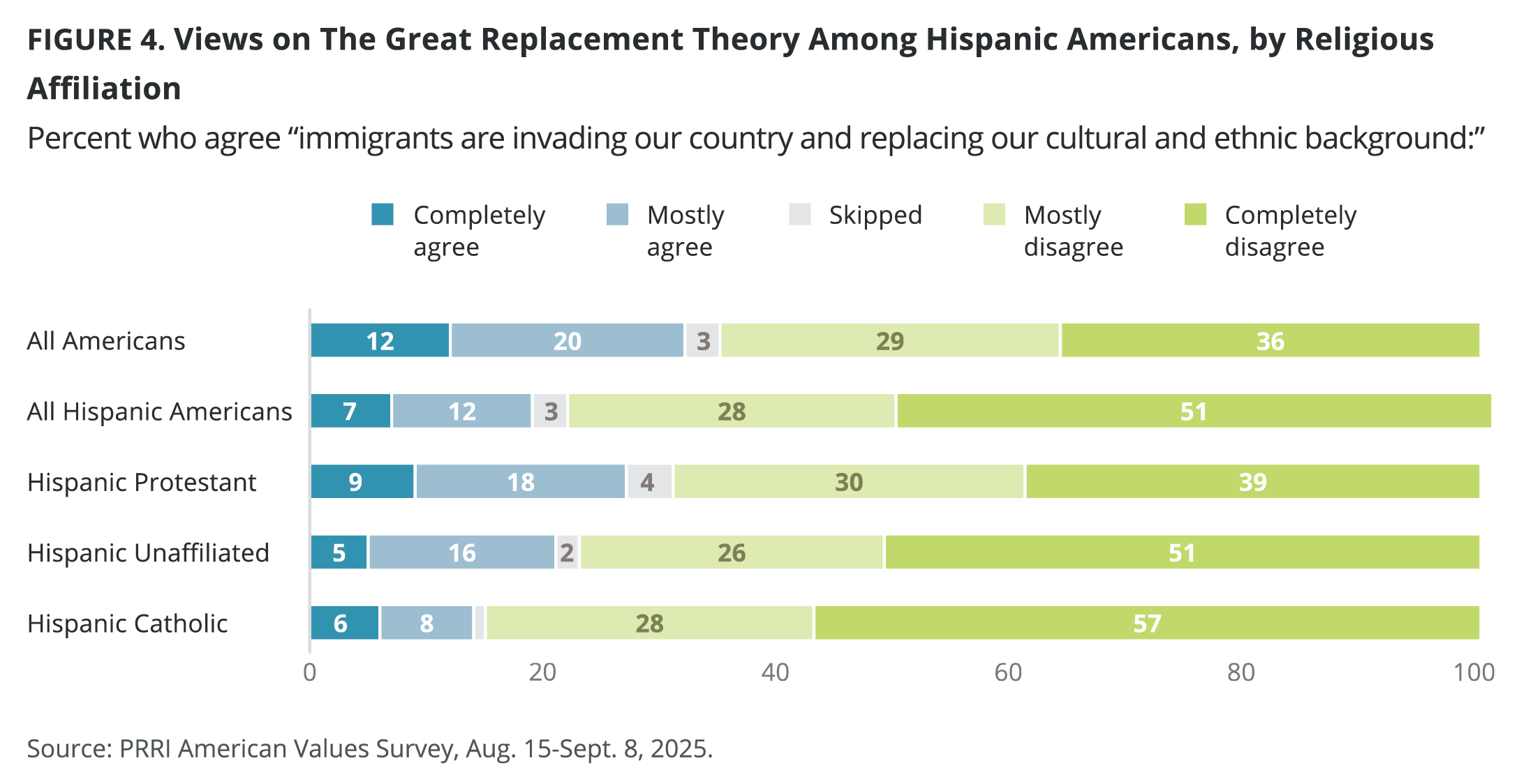 Agreement with the “Great Replacement Theory” (the idea that “Immigrants are invading our country and replacing our cultural and ethnic background”) is lower among Hispanic Americans (19%) than among Americans overall (32%). Hispanic Catholics show the lowest agreement (14% agree vs. 85% disagree), followed by unaffiliated Hispanic Americans (21% agree vs. 77% disagree). Hispanic Protestants are the most receptive to the Great Replacement Theory (27% agree vs. 69% disagree), though they are still less likely to support this idea than Americans overall.