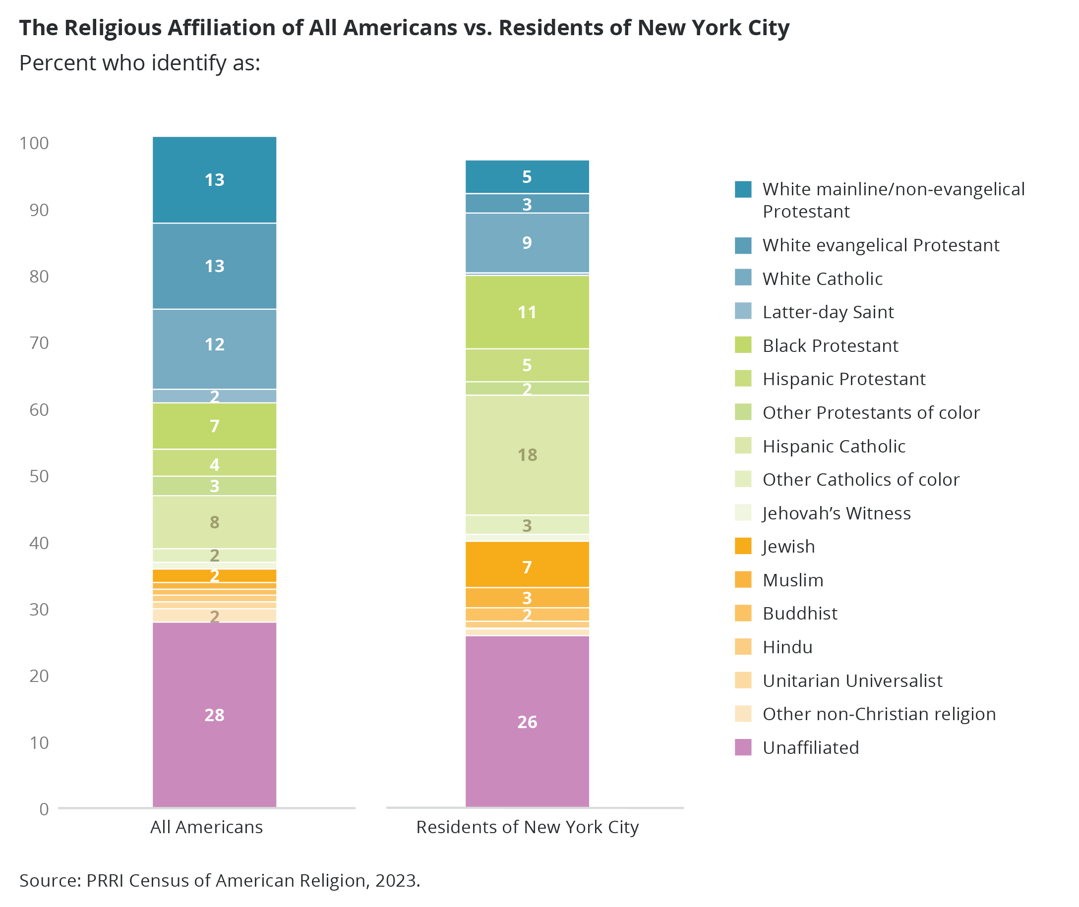 According to the 2023 PRRI Census of American Religion, the religious makeup of New York City is as follows: