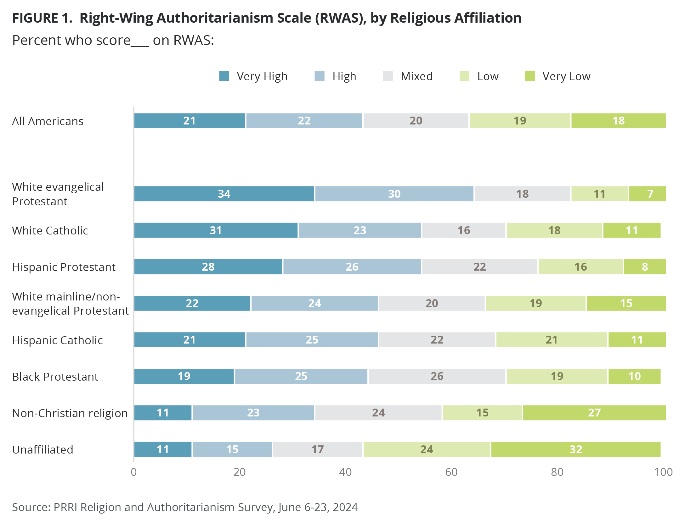 For example, PRRI’s 2024 Religion and Authoritarianism survey shows that a majority of Protestants across racial and ethnic groups score high on the Right-Wing Authoritarianism Scale (RWAS), including white evangelical Protestants (64%) and Hispanic Protestants (54%).