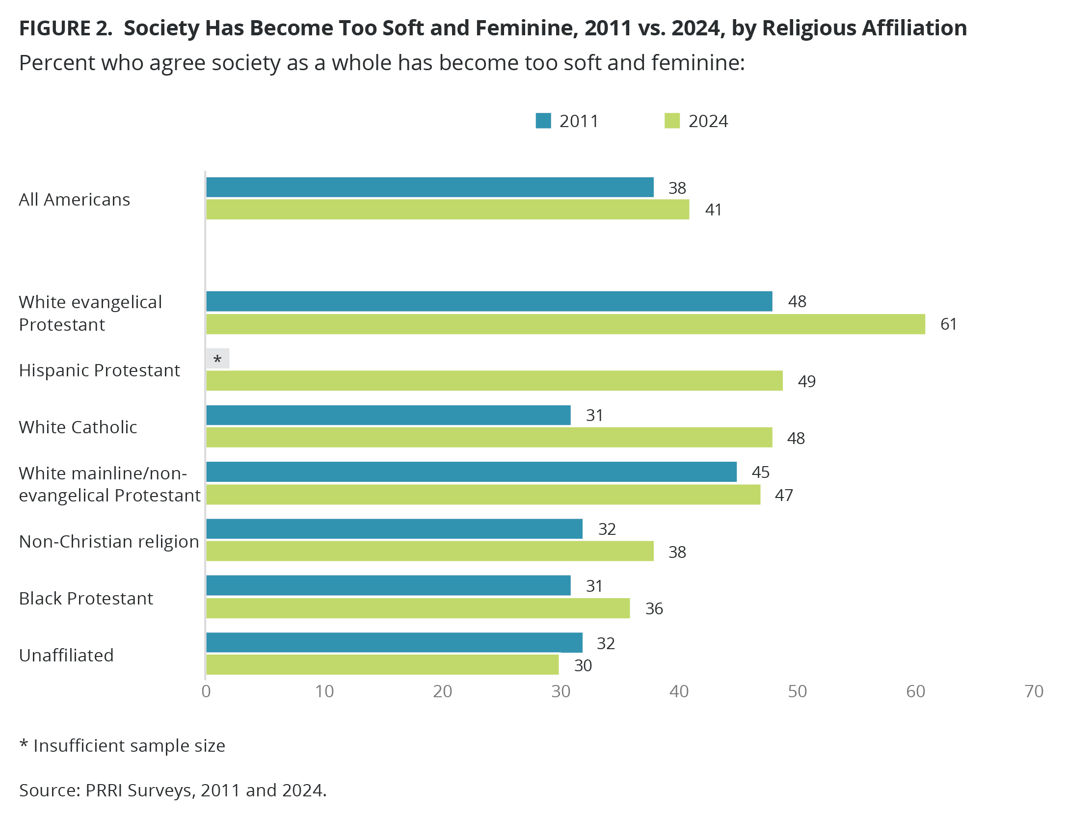 Agreement with the statement that “society as a whole has become too soft and feminine” has gone up among Christians since PRRI originally asked the question (notably from 48% in 2011 to 61% in 2024 among white evangelical Protestants and from 31% to 48% among white Catholics).