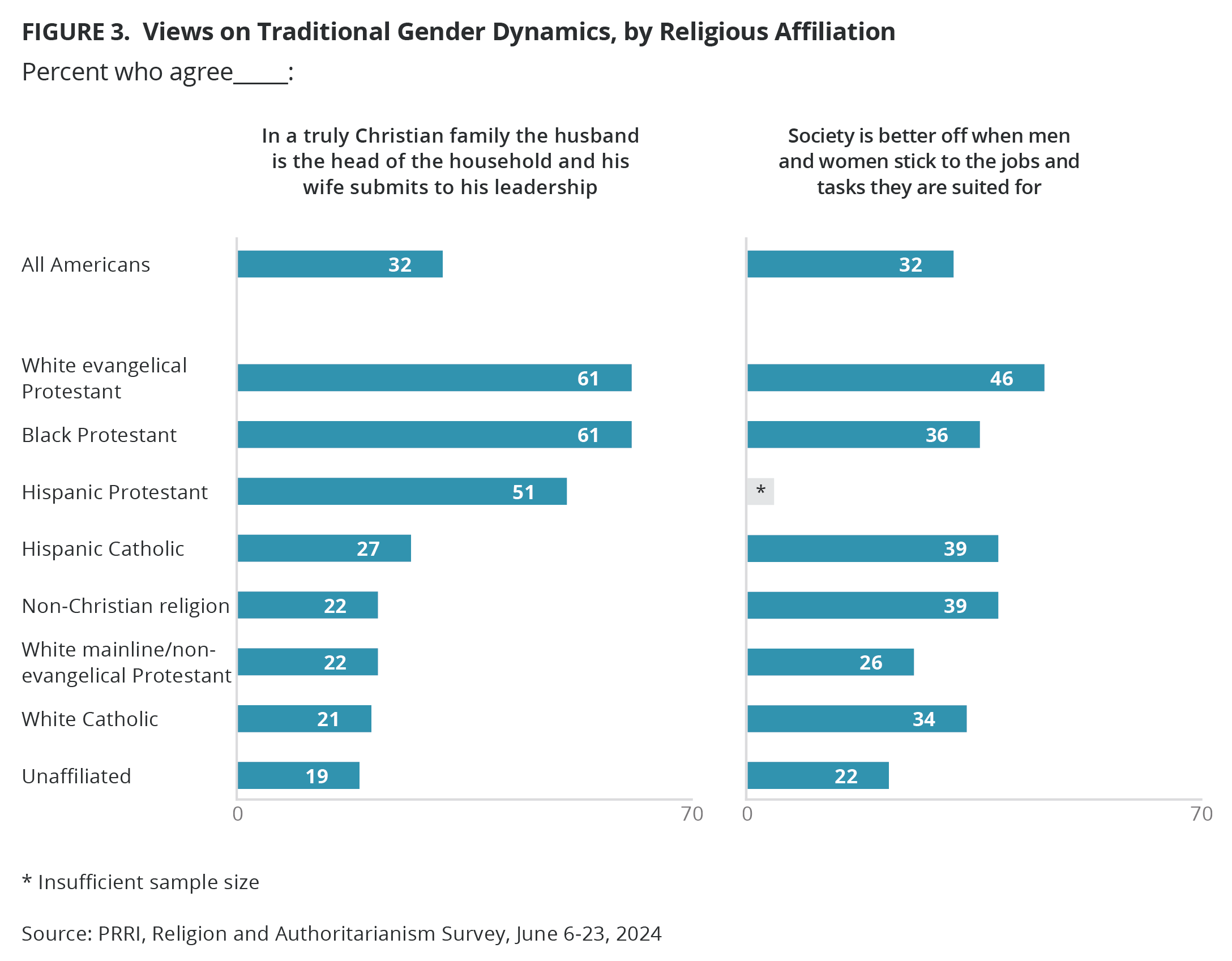 Moreover, majorities of white evangelical Protestants (61%), Black Protestants (61%), and Hispanic Protestants (51%) also agree with the statement that “in a truly Christian family, the husband is the head of the household and his wife submits to his leadership.” In addition, white evangelical Protestants (46%) are the most likely to agree that “society is better off when men and women should stick to the jobs and tasks they are naturally suited for.”