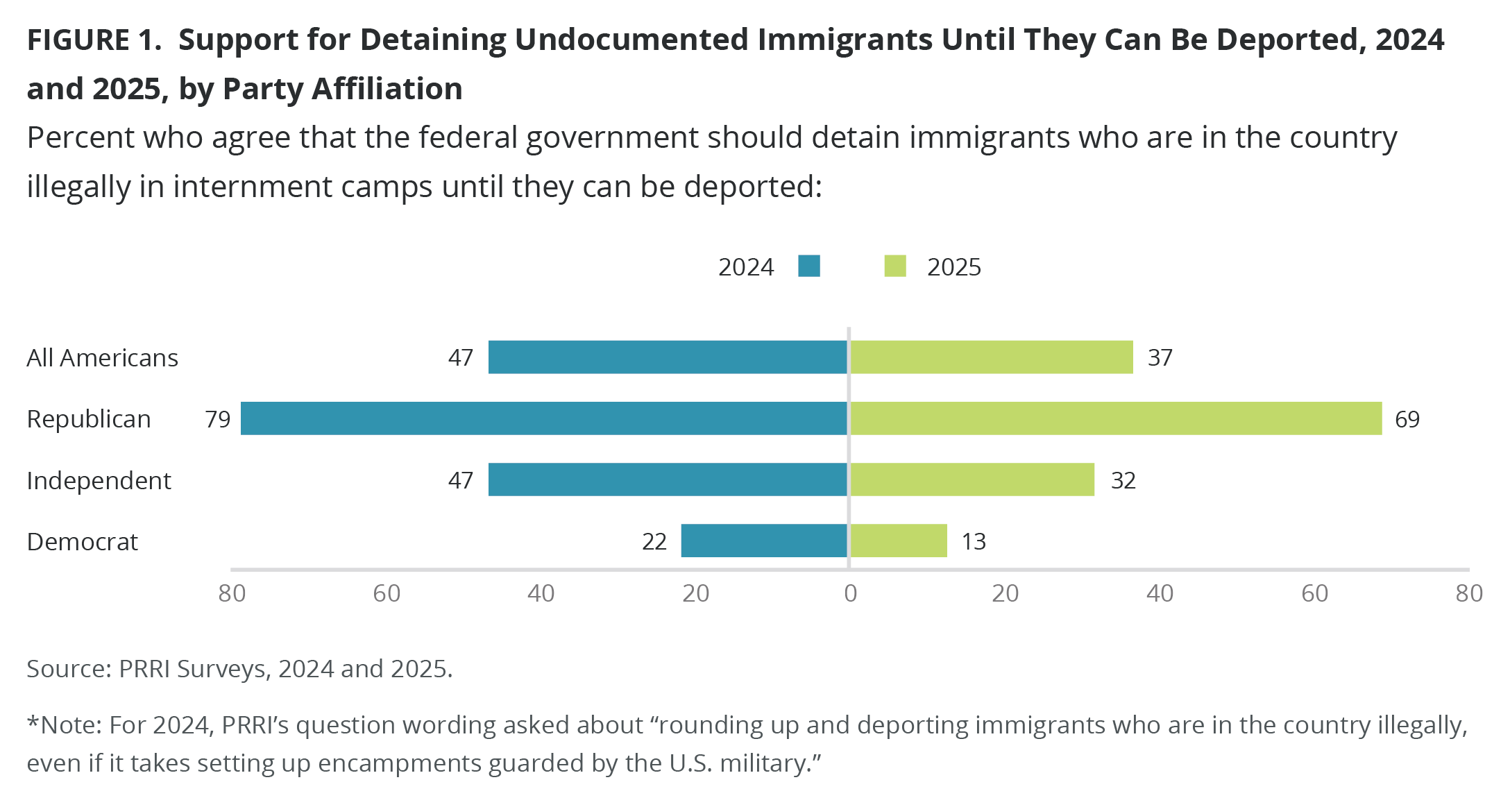 Last September, at the height of the anti-immigrant rhetoric of the presidential campaign, PRRI’s 2024 American Values Survey asked Americans about their views on “rounding up and deporting immigrants who are in the country illegally, even if it takes setting up encampments guarded by the U.S. military.” Nearly half of Americans (47%) agreed with the idea, including 22% of Democrats, 47% of independents, and 79% of Republicans.