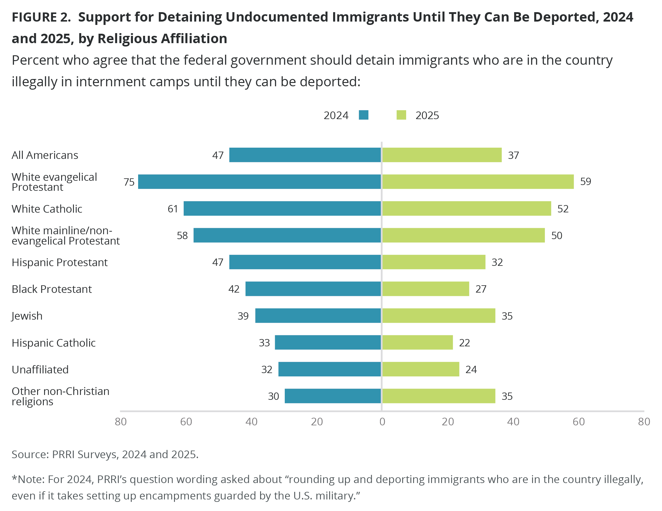 Notably, the decline in support for detaining and deporting immigrants spans party and religion. The 2025 PRRI American Values Survey finds that 69% of Republicans agree that the federal government should detain immigrants who are in the country illegally in internment camps until they can be deported, compared with 32% of independents and 13% of Democrats. Bearing in mind the change in question wording, support for the deportation and detention of undocumented immigrants dropped 9 percentage points among Democrats, 10 percentage points among Republicans, and 15 percentage points among independents.