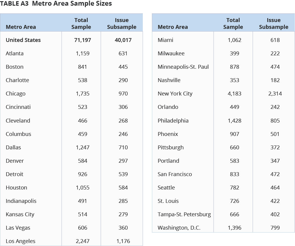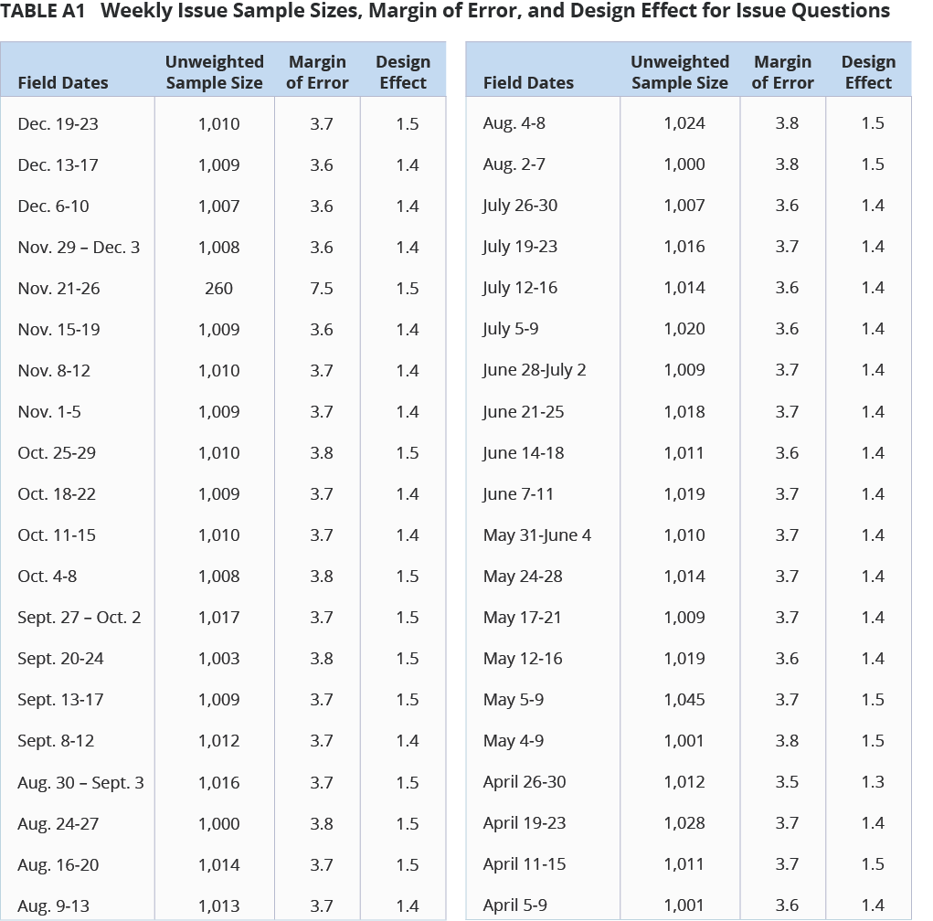 The margin of error for the sample is +/- 1.2 percentage points at the 95% level of confidence. The design effect is 1.4. Table 1 shows the margin of error and design effect for each weekly survey at the 95% level of confidence. Tables 2 and 3 show the sample sizes for each state and metro area. In addition to sampling error, surveys may also be subject to error or bias due to question wording, context, and order effects.