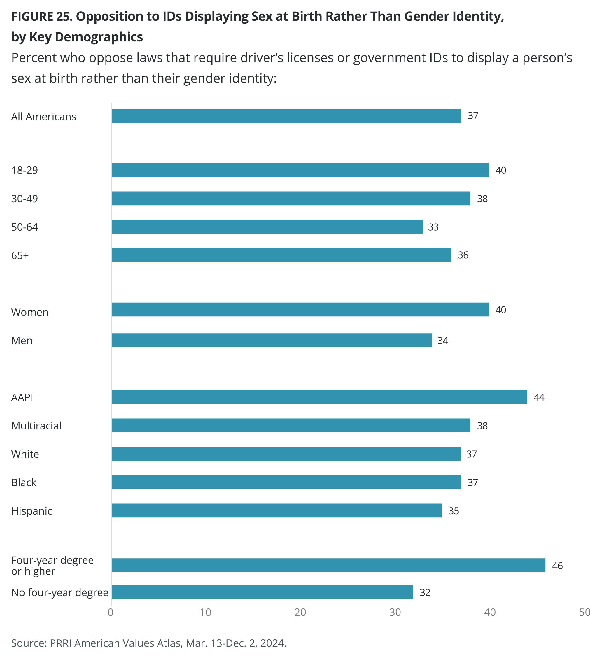 Americans with a four-year degree or higher are notably more likely than those without a four-year degree to oppose laws that require IDs to show a person’s sex at birth and not their gender identity (46% vs. 32%).