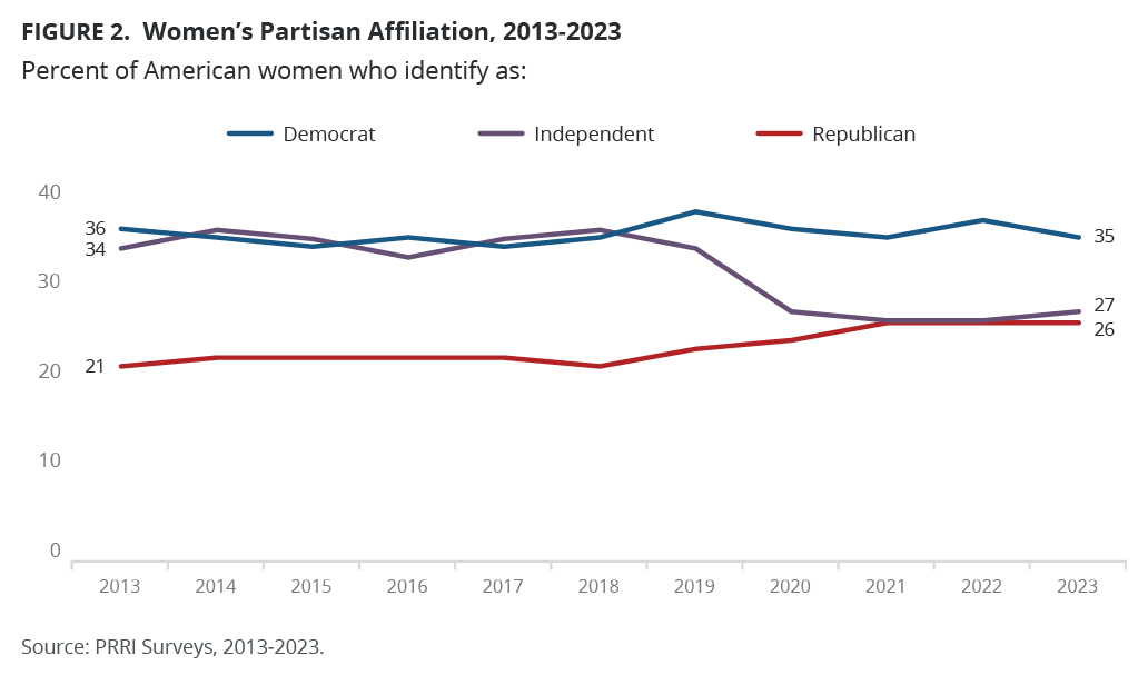 [2] The percentage of women who are religiously unaffiliated who identify with another party or refused to answer has increased fourfold over the past decade from 5% to 19%.